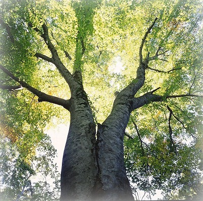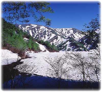 「六月の陽光を受け2mの積雪からブナが芽吹く季節が始まる。」朝日連峰、大鳥池周辺