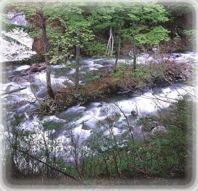「雪代水で増水した、東大鳥川」朝日連峰七つ滝沢から大鳥池の間」