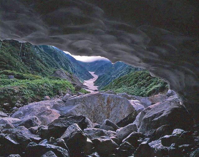 「滴り落ちる雪渓の雫、初秋の石転び沢」 飯豊連峰石転び沢 出会