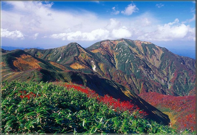 「ナナカマド色づく中秋の杁差岳」飯豊連峰、大石山より