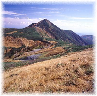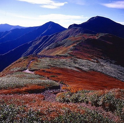 秋色の大朝日岳、中ほどは金玉水の水場(中岳より撮影)