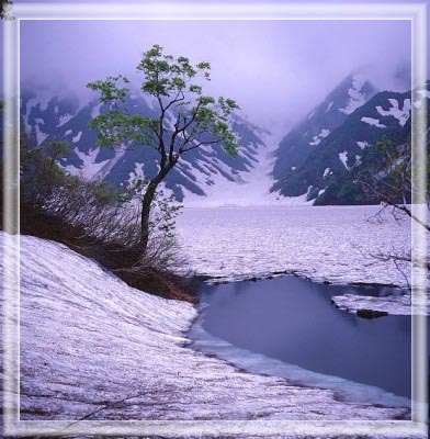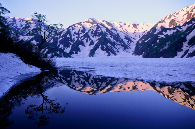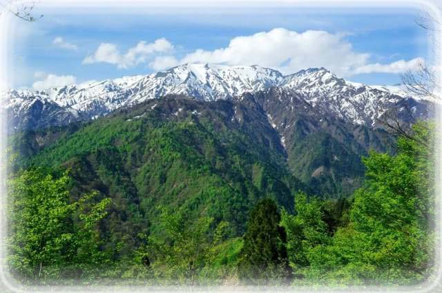 残雪の白と木々の緑に空の青。春の三段染めは、地上に現れた天上の極楽。