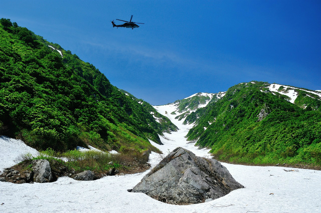 遭難救助でも、遊覧飛行でもありません。自衛隊ヘリの山岳救助訓練のようでした。