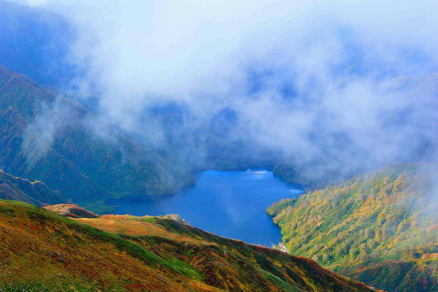「大鳥池の伏流水が涼を呼ぶ」朝日連峰、七ツ滝沢と大鳥池間